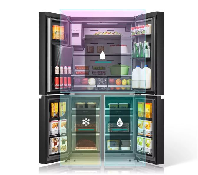 - Triple Cooling System: سه مدار سرمایش مستقل برای بخشهای یخچال و فریزر که از ترکیب بوی مواد جلوگیری کرده و رطوبت را بهینه نگه میدارد.