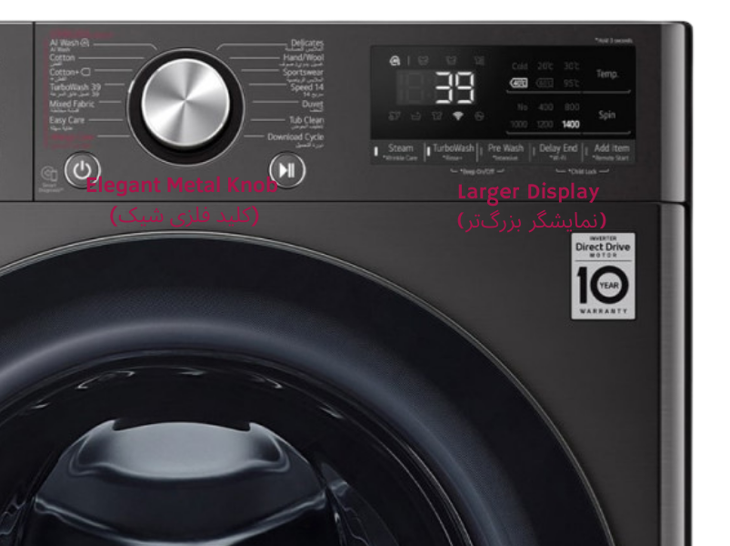 ![]() | Design – نمایانتر و شیکتر ماشین لباسشویی LG WR9011PBG با رویکردی مدرنتر در طراحی، تجربه کاربری را بهبود بخشیده است. نمایشگر بزرگتر و خواناتر، مشاهده وضعیت شستوشو، تنظیمات و زمان باقیمانده را حتی از فاصله دور ساده میکند. همچنین کلید ولومی بزرگتر با روکش فلزی براق نهتنها به زیبایی و حس لوکس دستگاه افزوده، بلکه کارکرد راحتتر و دقیقتر را هنگام انتخاب برنامهها فراهم میسازد. این ترکیب ظاهری، هماهنگ با رنگ Titanium Gray، جلوهای مینیمال و حرفهای برای محصول ایجاد کرده است. |