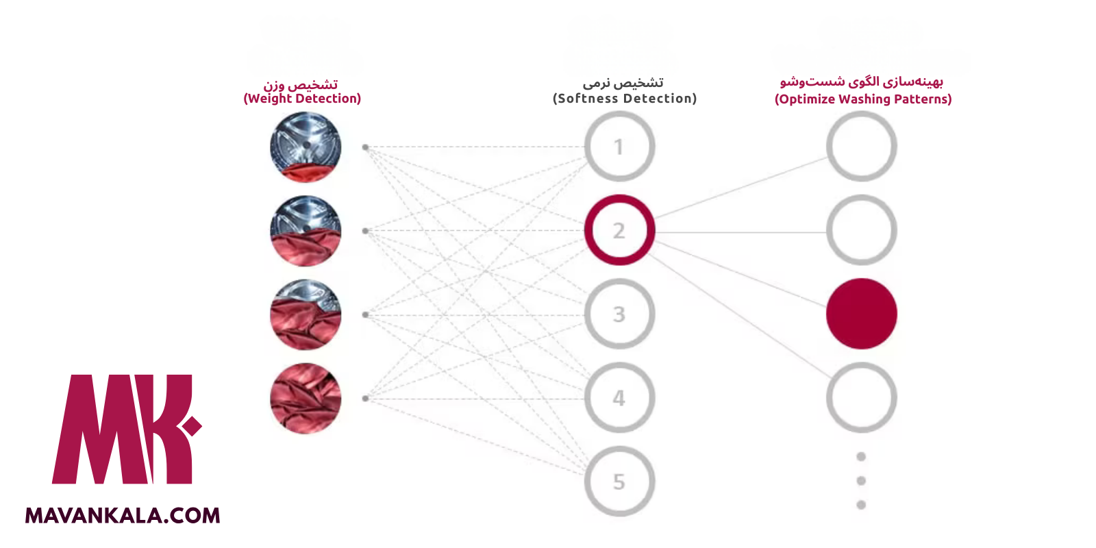 تکنولوژی AI DD (AI Direct Drive) جهت تشخیص وزن و جنس پارچه و انتخاب الگوی حرکت شستشوی مناسب مطابق آن